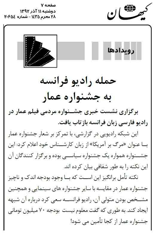 سازمان Anti Defamation League (اتحادیه ضدافترا) یکی از مشهورترین لابی های سیاسی فرهنگی صهیونسیم در ایالات متحده به برگزاری چهارمین جشنواره مردمی فیلم عمار واکنش نشان داد.